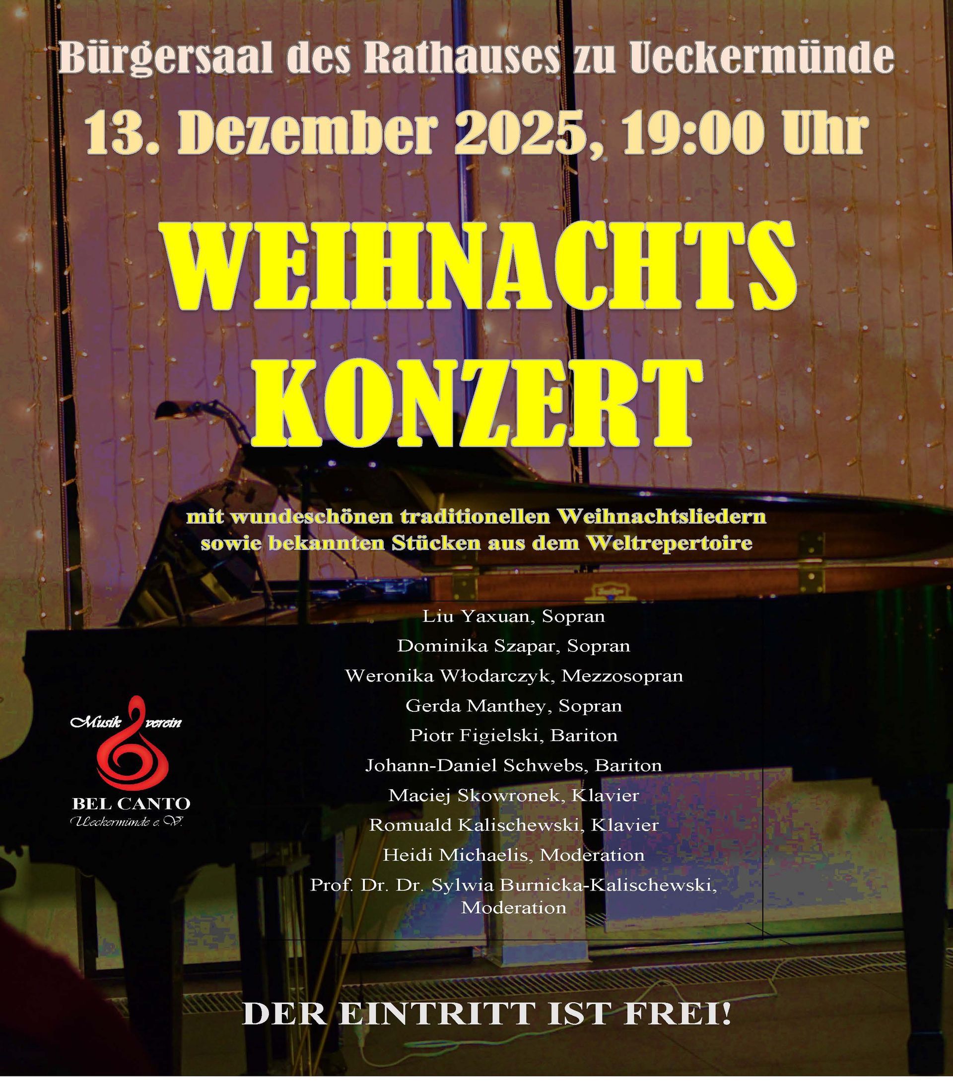 Am 13. Dezember 2025 laden der Musikverein BEL CANTO Ueckermünde e.V. und Seebad Stadt Ueckermünde zum Weihnachtskonzert ein, das im Bürgersaal des Rathauses zu Ueckermünde um 19:00 Uhr stattfindet. Es wird wieder Dreiländerkonzert mit Sängern aus Deutschland, Polen und China sein. Die Region wird von den Schüler der Kreismusikschule Uecker-Randow vertreten. Greta Manthey (Sopran) und Johann-Daniel Schwebs (Bariton) werden von Romuald Kalischewski am Flügel begleitet. Von der Hochschule der Künste Stettin werden: Sopranistinnen Liu Yaxuan, Dominika Szapar sowie Mezzosopranistin Weronika Włodarczyk und Bariton Piotr Figielski einreisen. Sie Studentinnen und Studenten werden von Maciej Skowronek am Flügel begleitet. Alle Sängerinnen und Sänger sind Preisträger verschiedener Musik- und Gesangswettbewerbe. Prof. Dr. Dr. Sylwia Burnicka-Kalischewski, die fast alle Gesangstalente unterrichtet, verspricht ein weihnachtliches Feuerwerk mit zahlreichen Duetten (in deutsch-polnischer, deutsch-chinesischen und chinesisch-polnischer Besetzung) sowie die beliebtesten Werke aus dem Weltrepertoire und bekannten, traditionellen Weihnachtslieder, die einfach jeder kennt und liebt. Das Weihnachtsprogramm des Konzertes am 13. Dezember beinhaltet zum Beispiel das Humperdinks Duett „Brüderchen, komm, tanz mit mir“ aus der Oper „Hänsel und Gretel“, die Arie der Königin der Nacht aus Mozartoper „Die Zauberflöte“, Arien und Duette aus den Operetten von Johann Strauss: „Der Zigeunerbaron“ und „Die Fledermaus“, die im Jubiläumsjahr von 200. Geburtstag von Johann Strauß Sohn nicht fehlen dürfen und viele anderen Stücke, die Sie begeistern werden. Moderation an dem Abend übernimmt der Bürgermeister der Stadt Seebad Ueckermünde Jürgen Kliewe. Der Eintritt ist frei! Wir stimmen Sie auf Weihnachten ein! Herzliche Einladung!